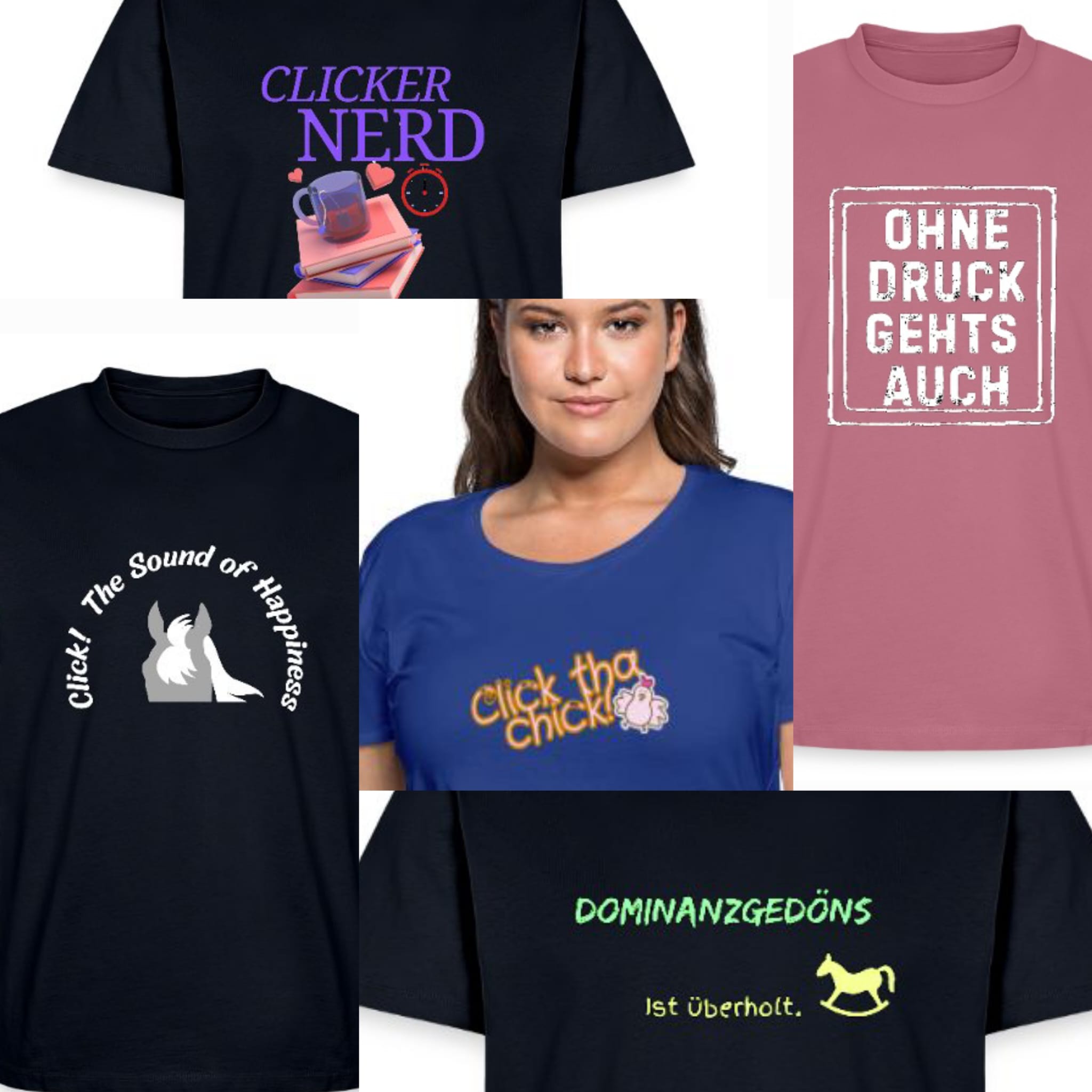 Im Clickernetzwerk mit Nina Steigerwald gab es den Themenabend "Qualifizierte Antworten auf unqualifizierte Sprüche". Daraus entstand in unserer Ausbildung zum "Trainingsspezialist Pferd" die Idee Statements und Bilder auf Shirts zu drucken.